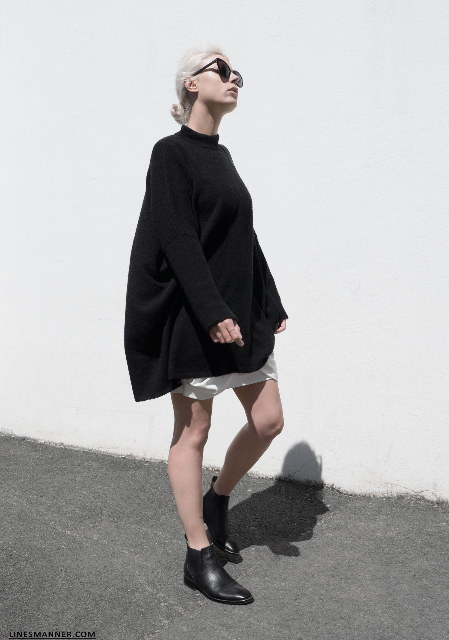 The oversized slouchy sweater meets the draped dress and creates an “all in the details” situation, invigorating this balance of proportions. A pair of black leather boots is a solid advantage to this minimal ensemble.