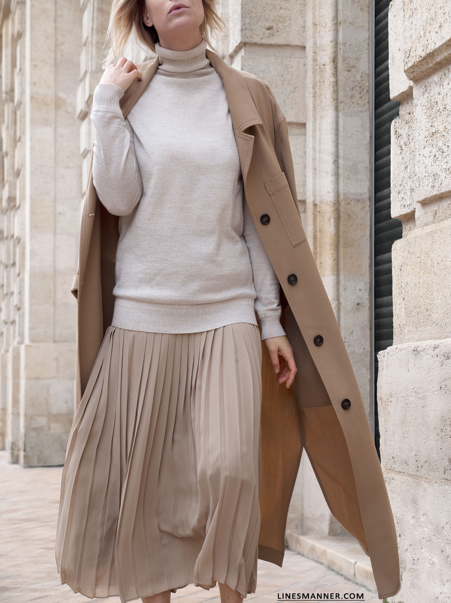 Jupe plissée, col roulé en cachemire et trench en sergé de laine.