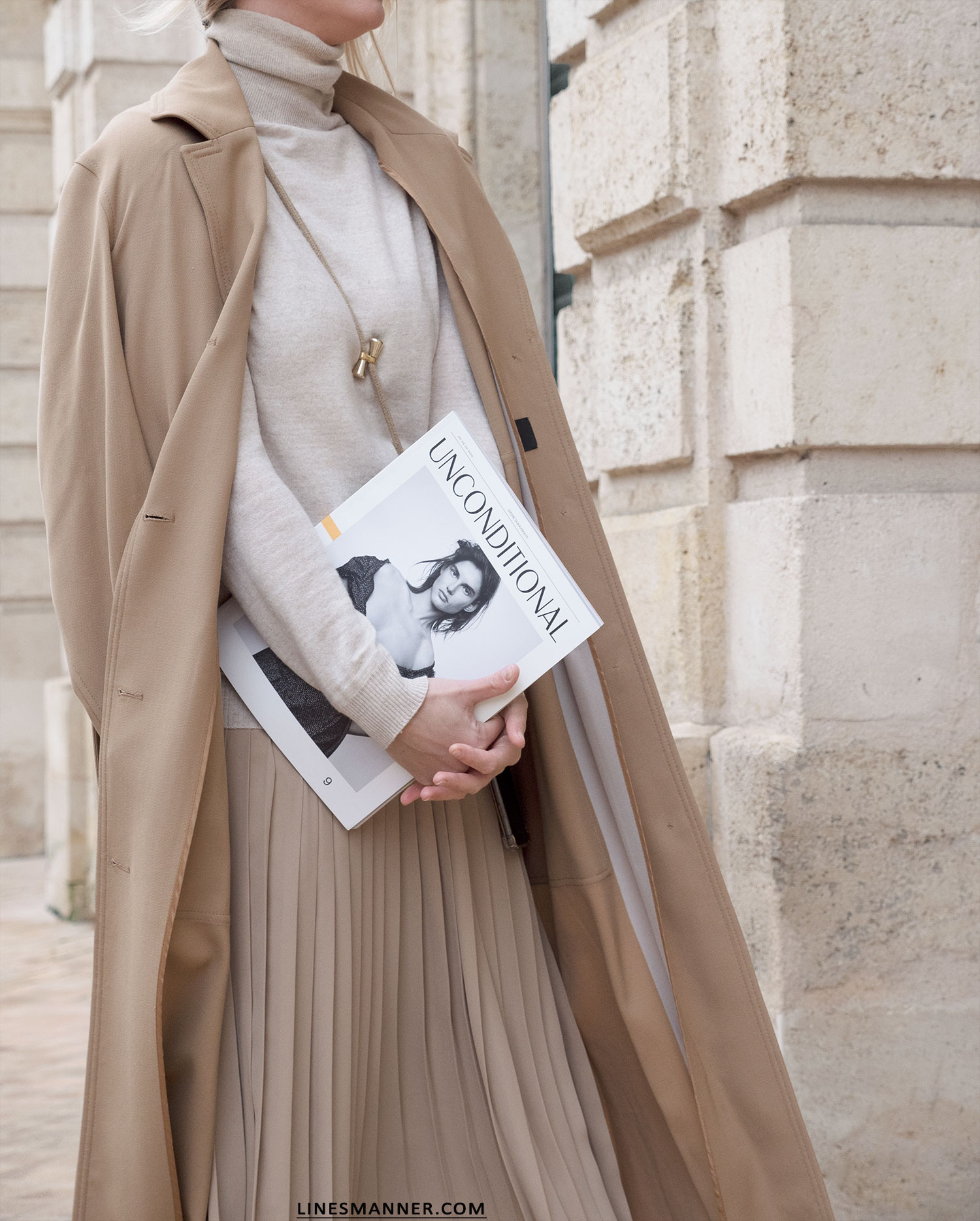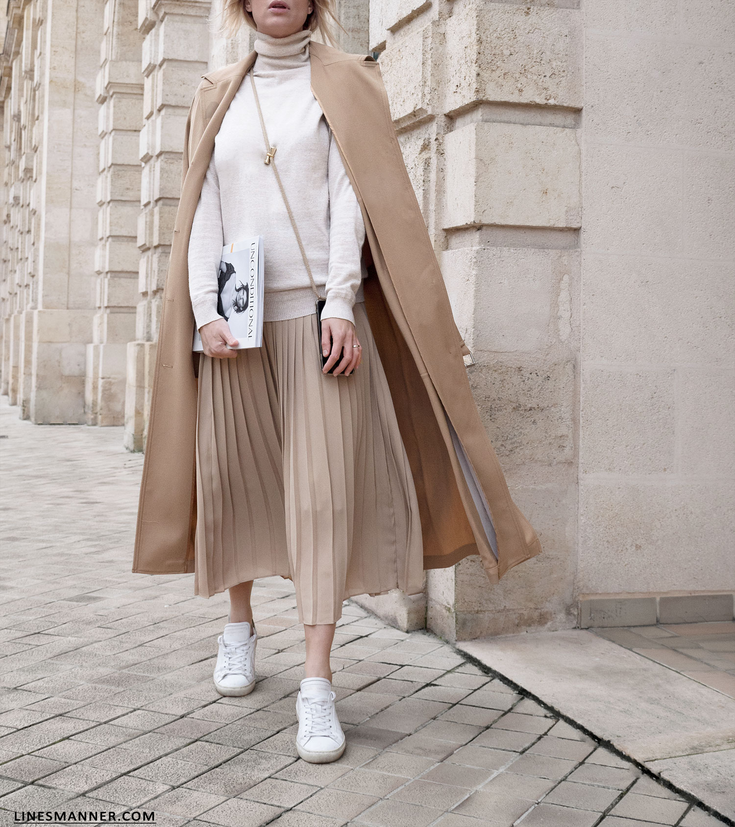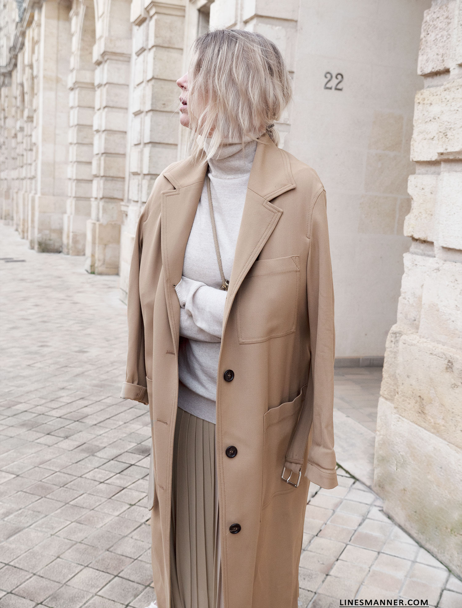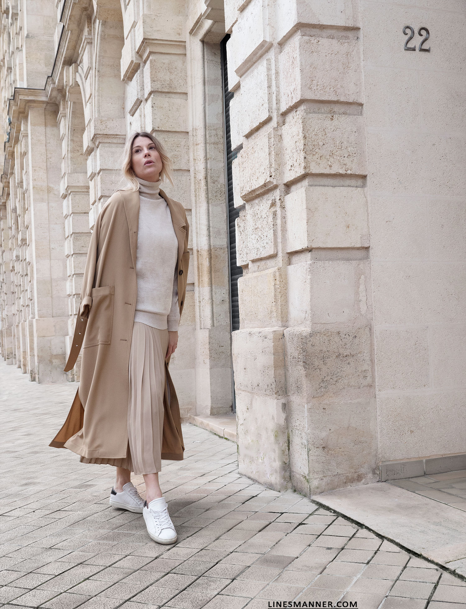 Silky pleated skirt, cashmere turtleneck and wool twill trench.