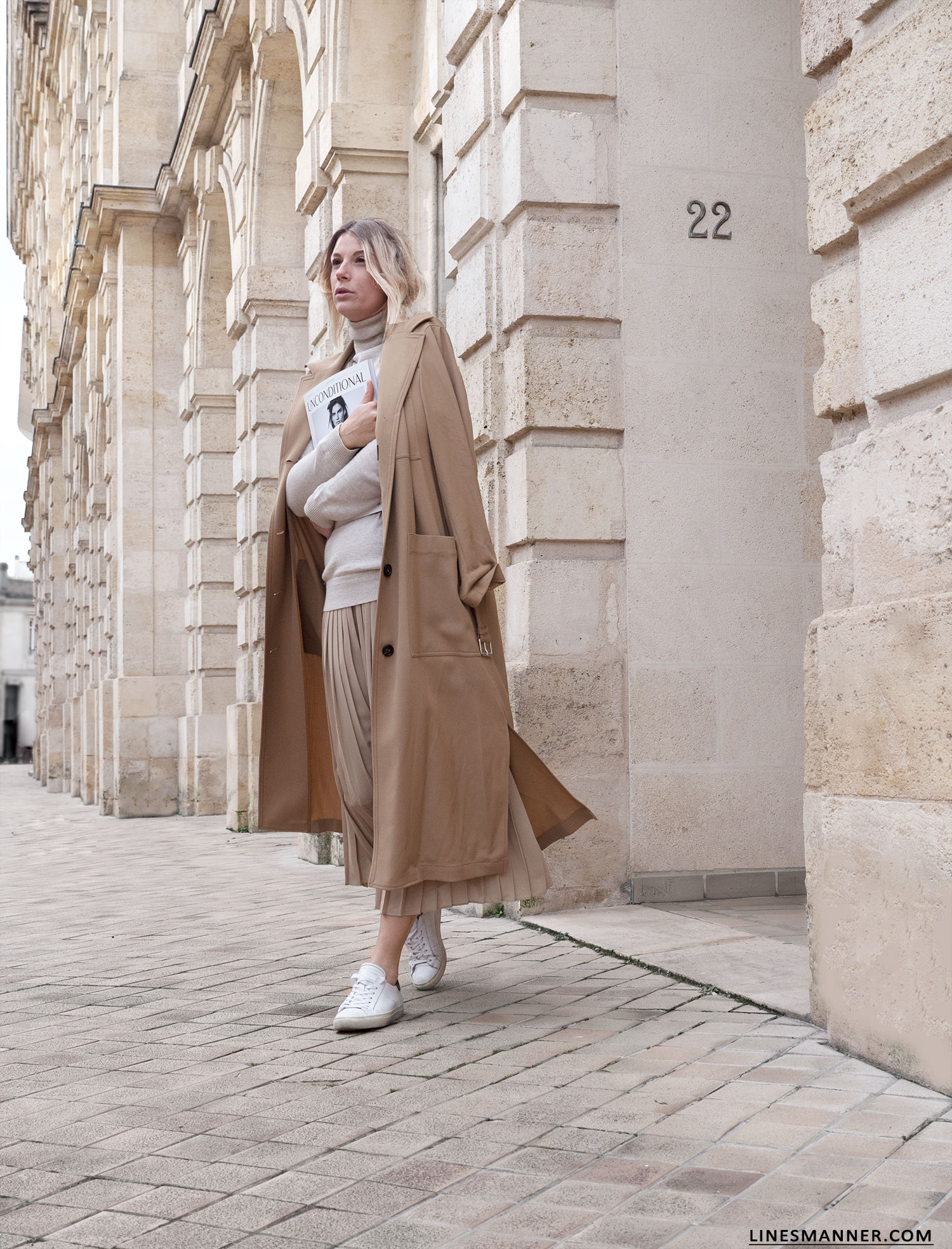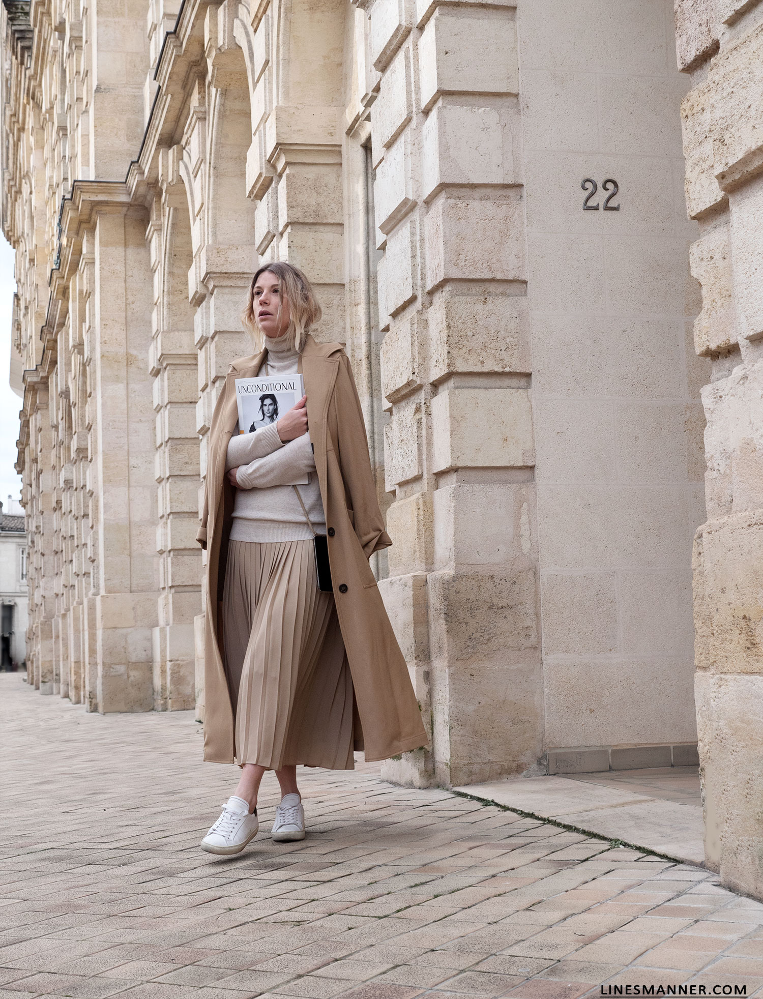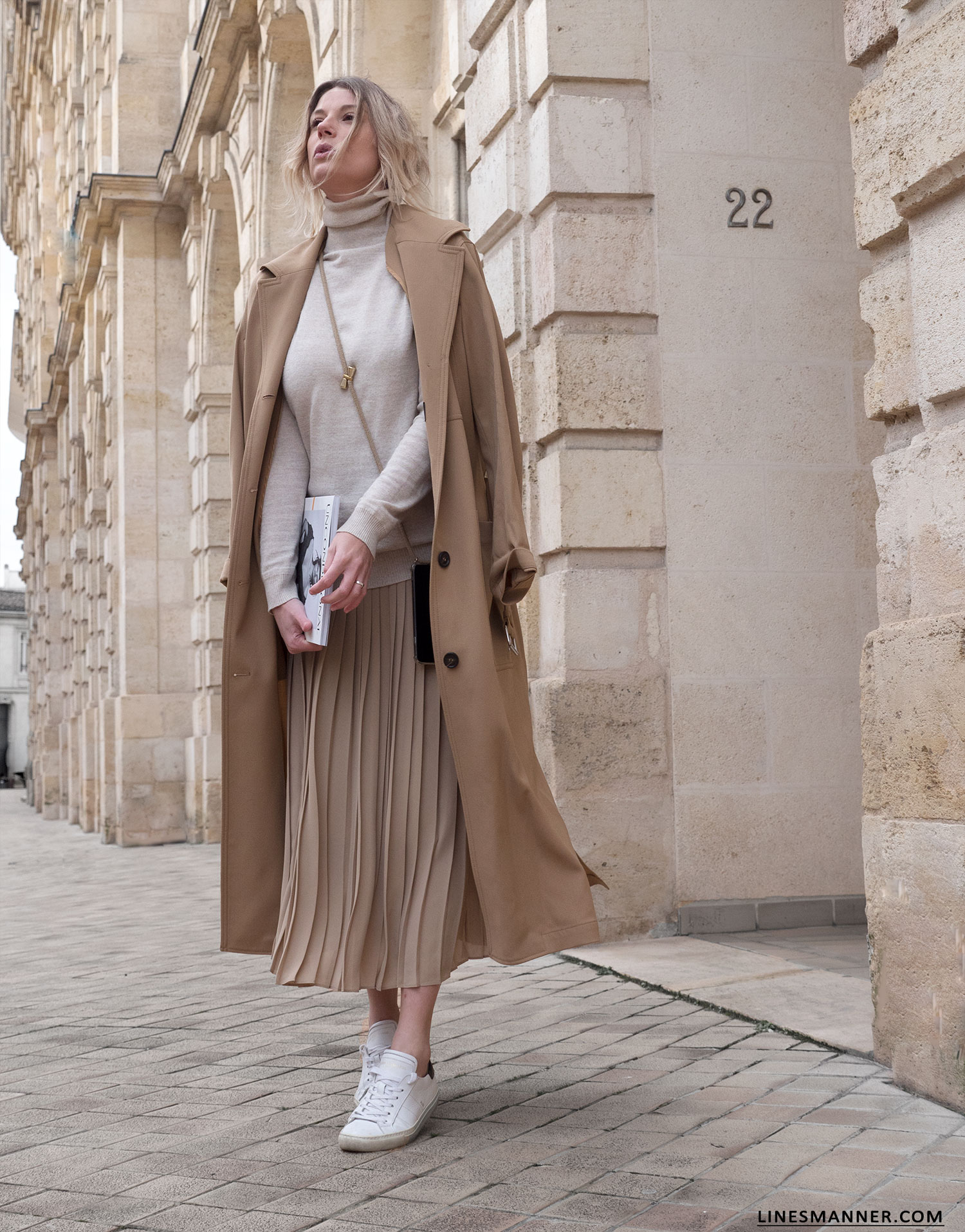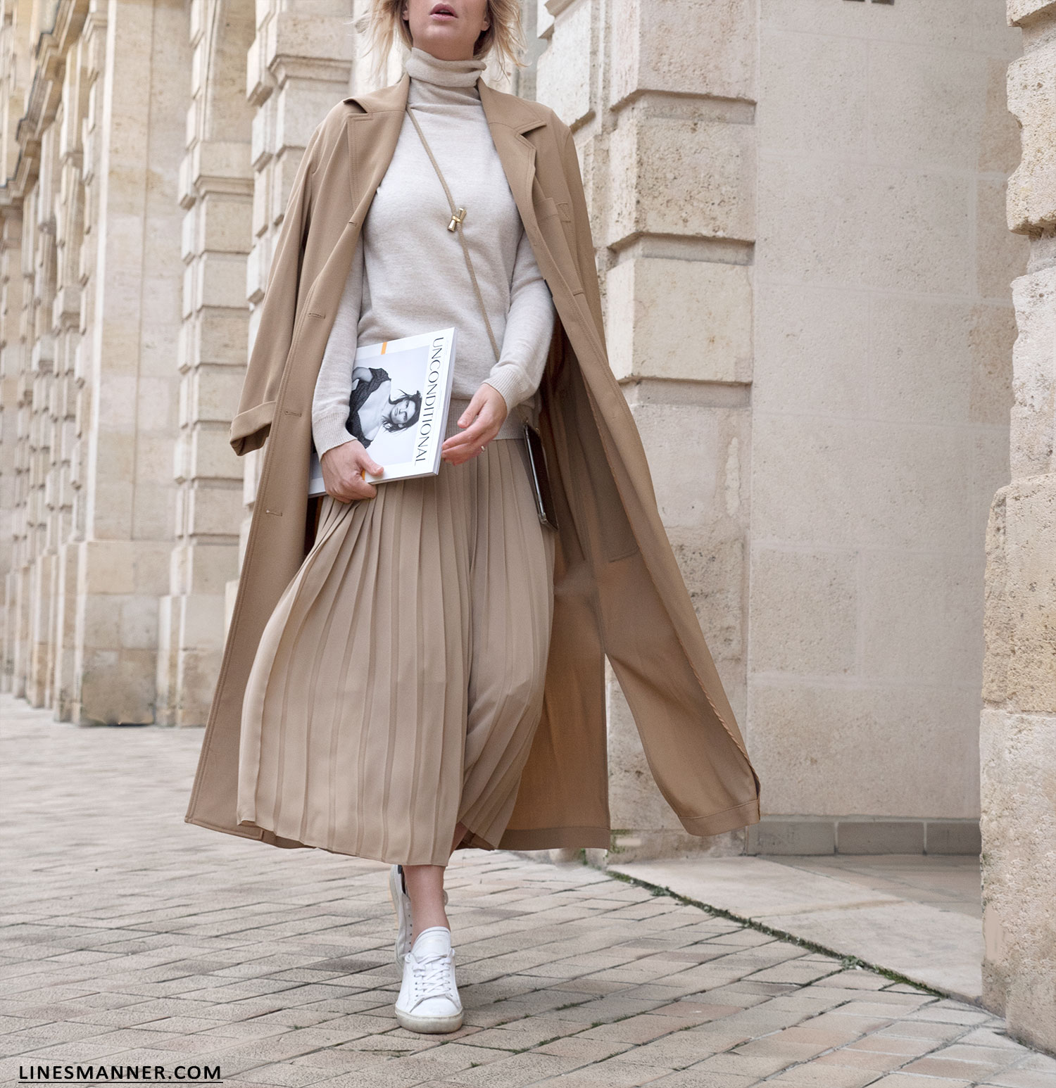 Silky pleated skirt, cashmere turtleneck and wool twill trench.