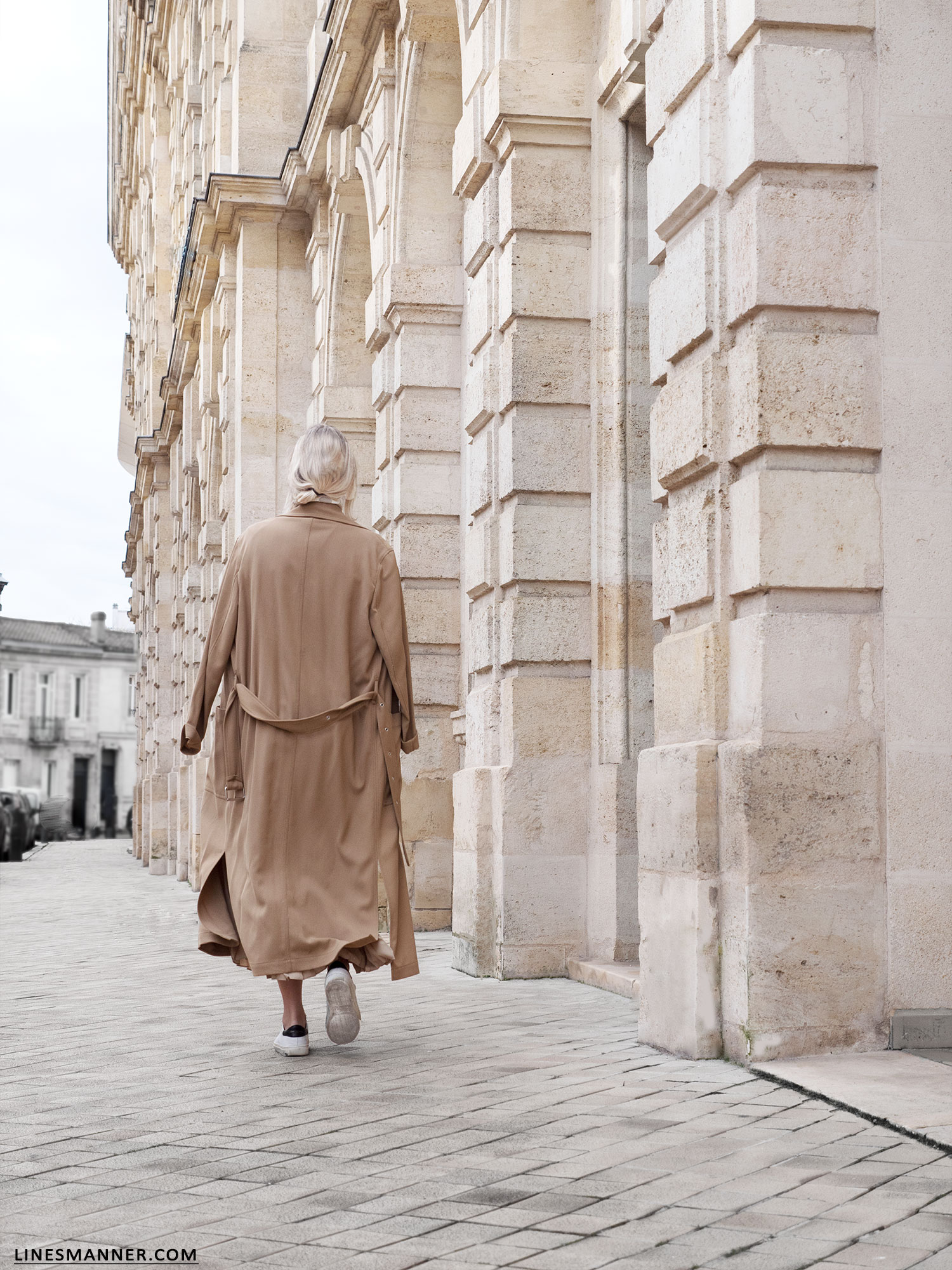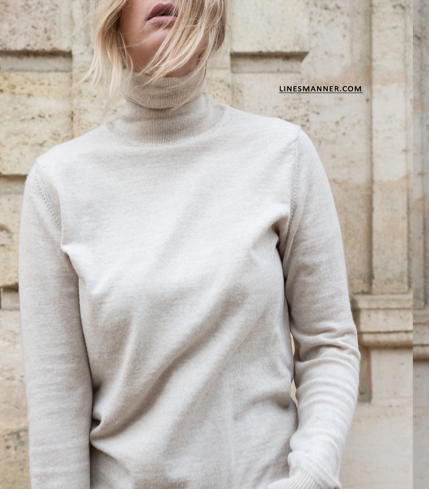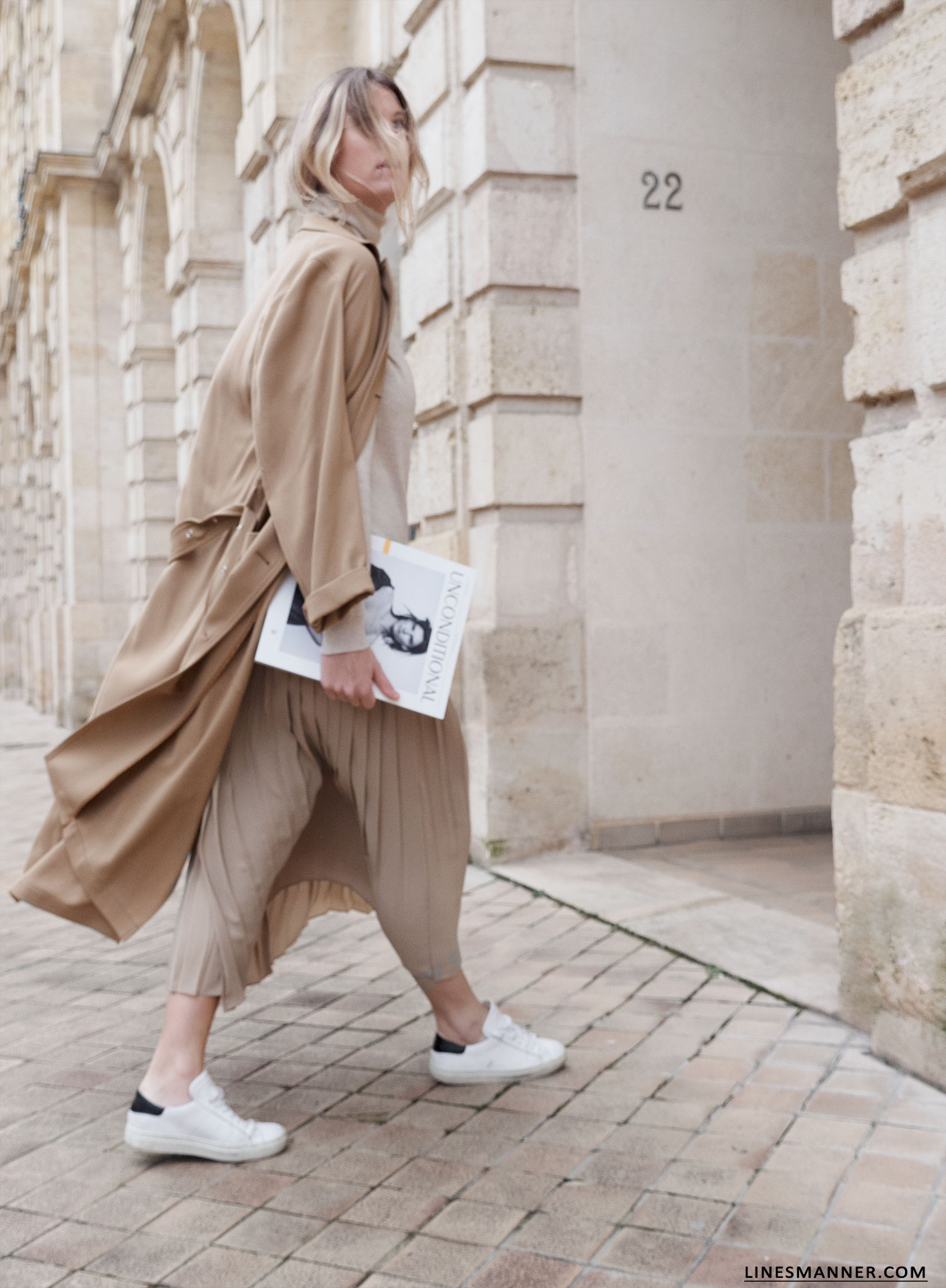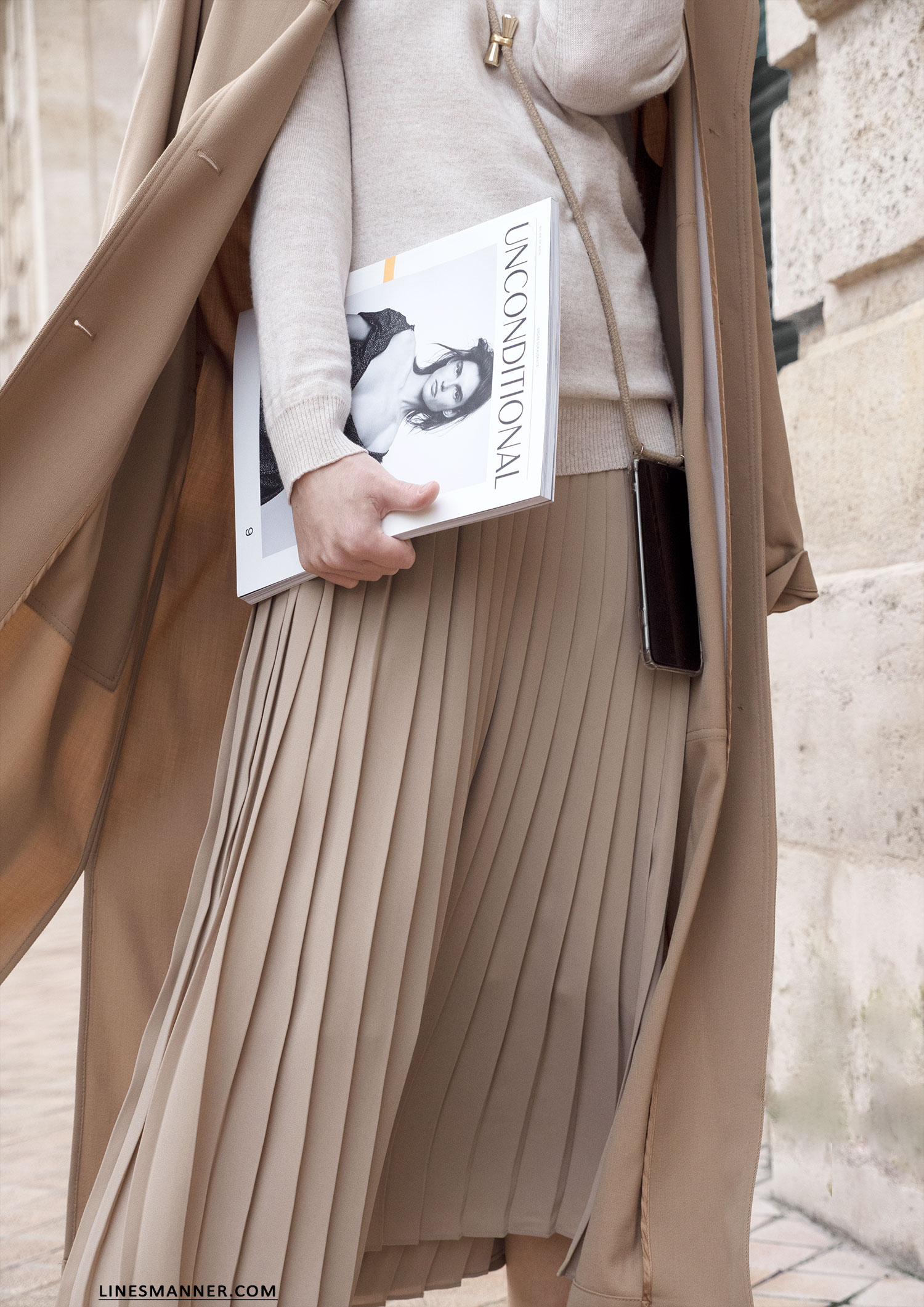 Silky pleated skirt, cashmere turtleneck and wool twill trench.