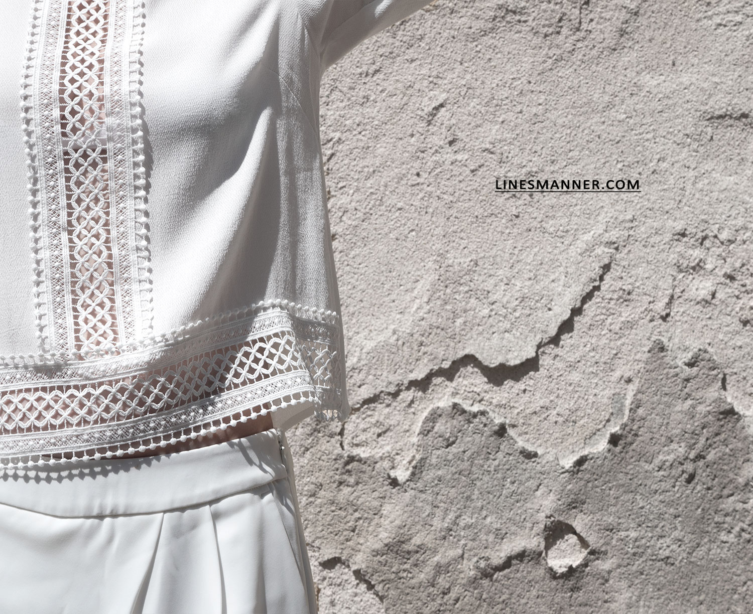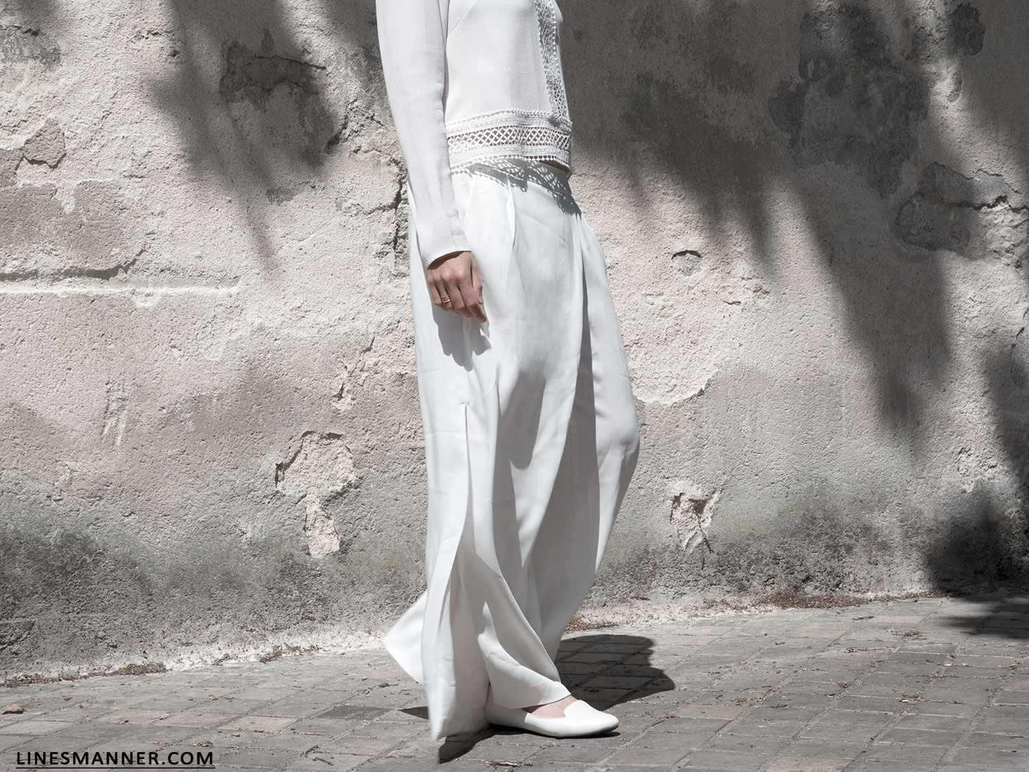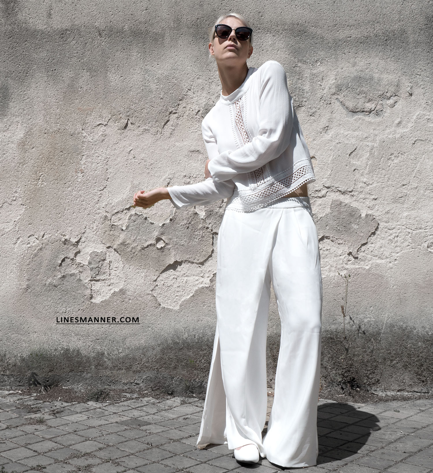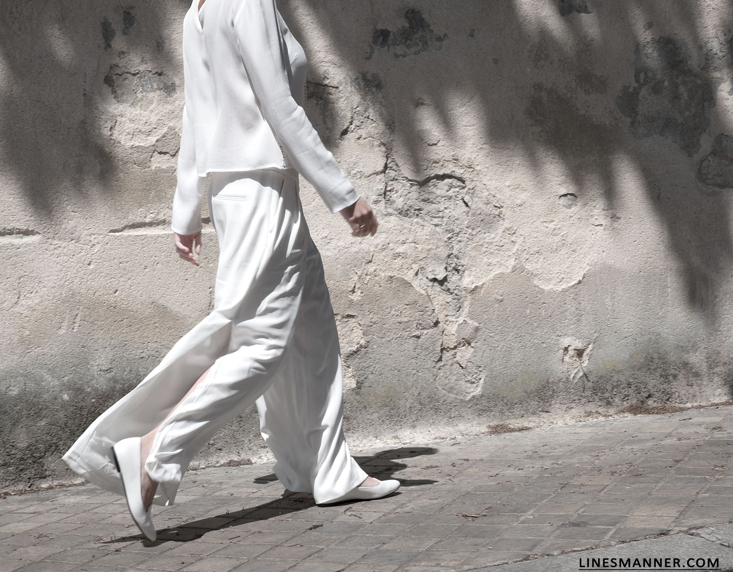 Head-to-toe white with perforated vs laced details, structure vs unstructured, liquid movement, a blend of textures, and the barest essentials.