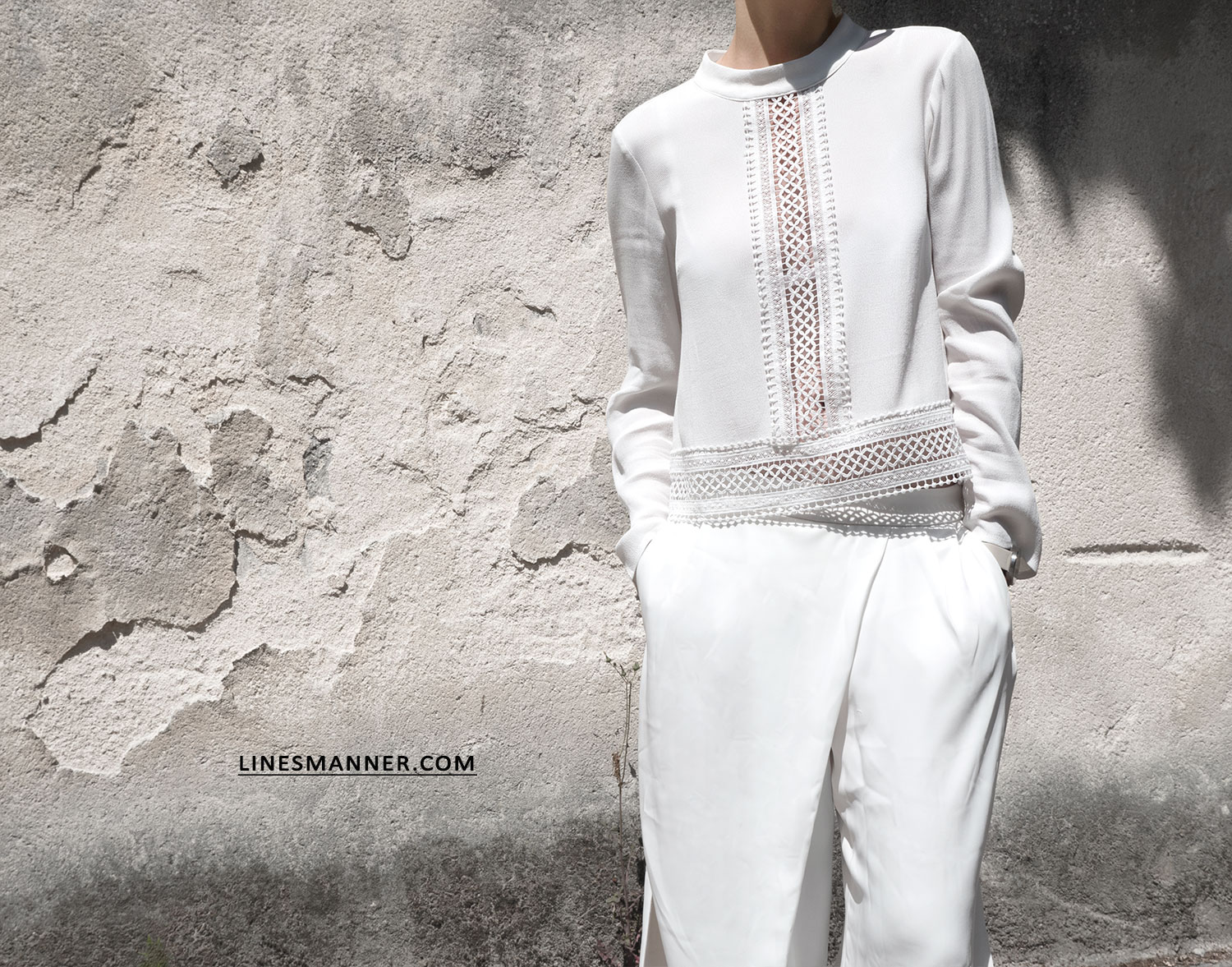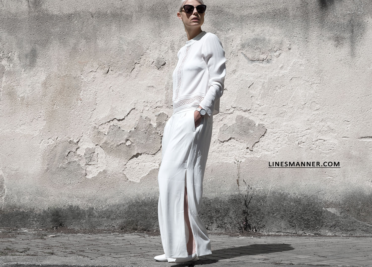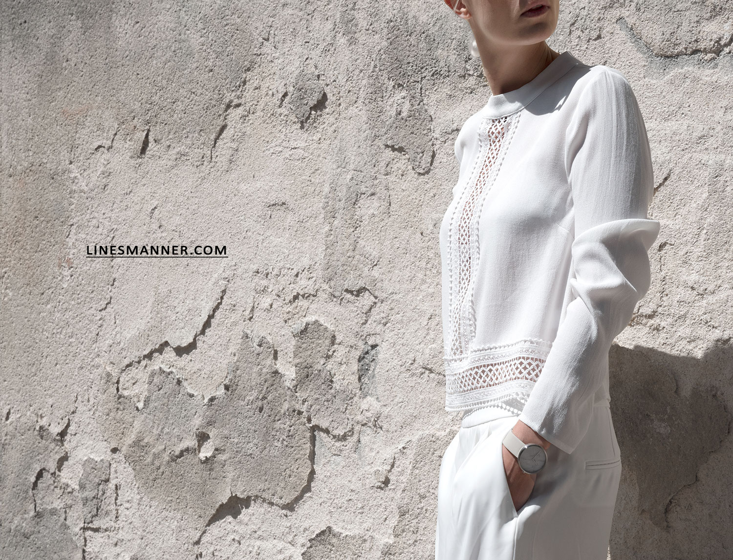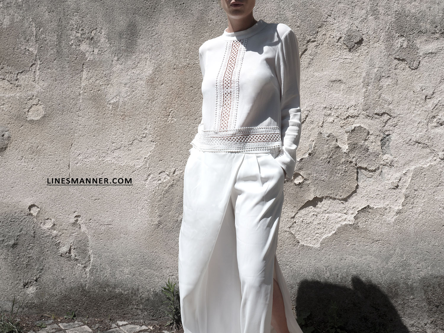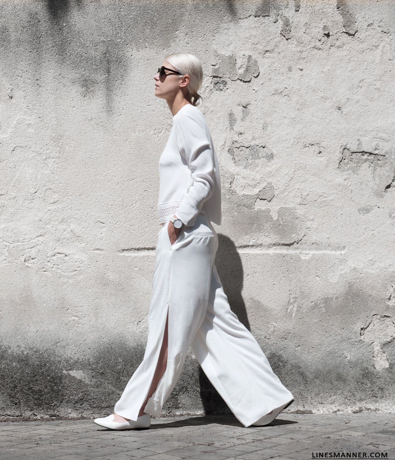 Head-to-toe white with perforated vs laced details, structure vs unstructured, liquid movement, a blend of textures, and the barest essentials.