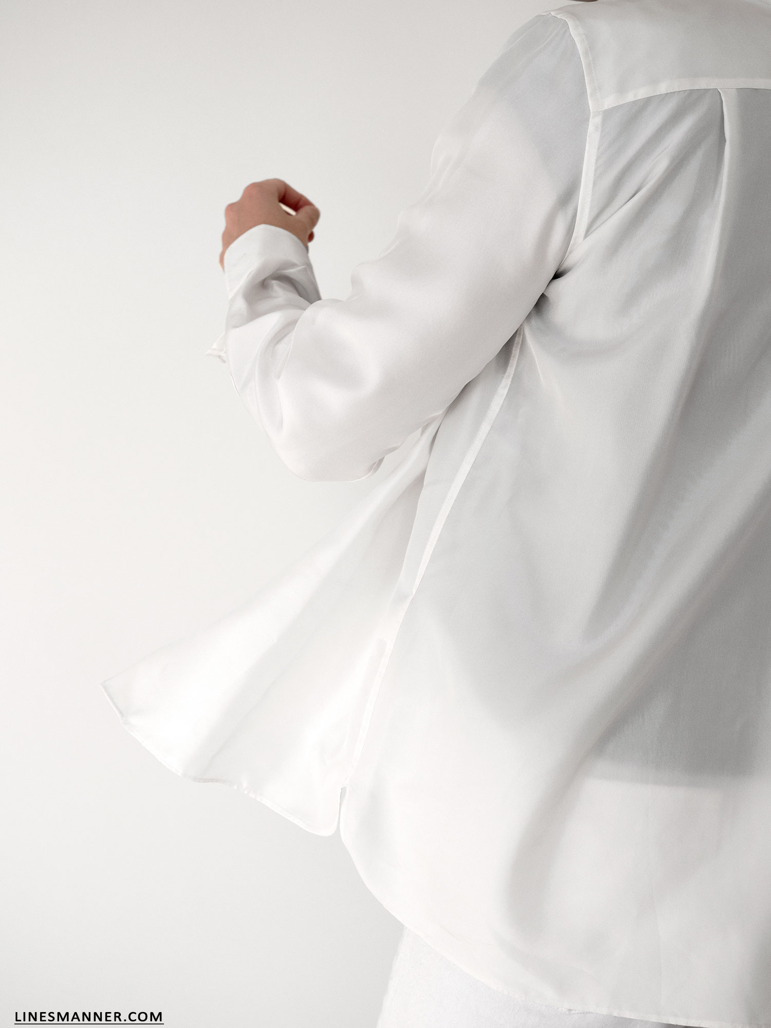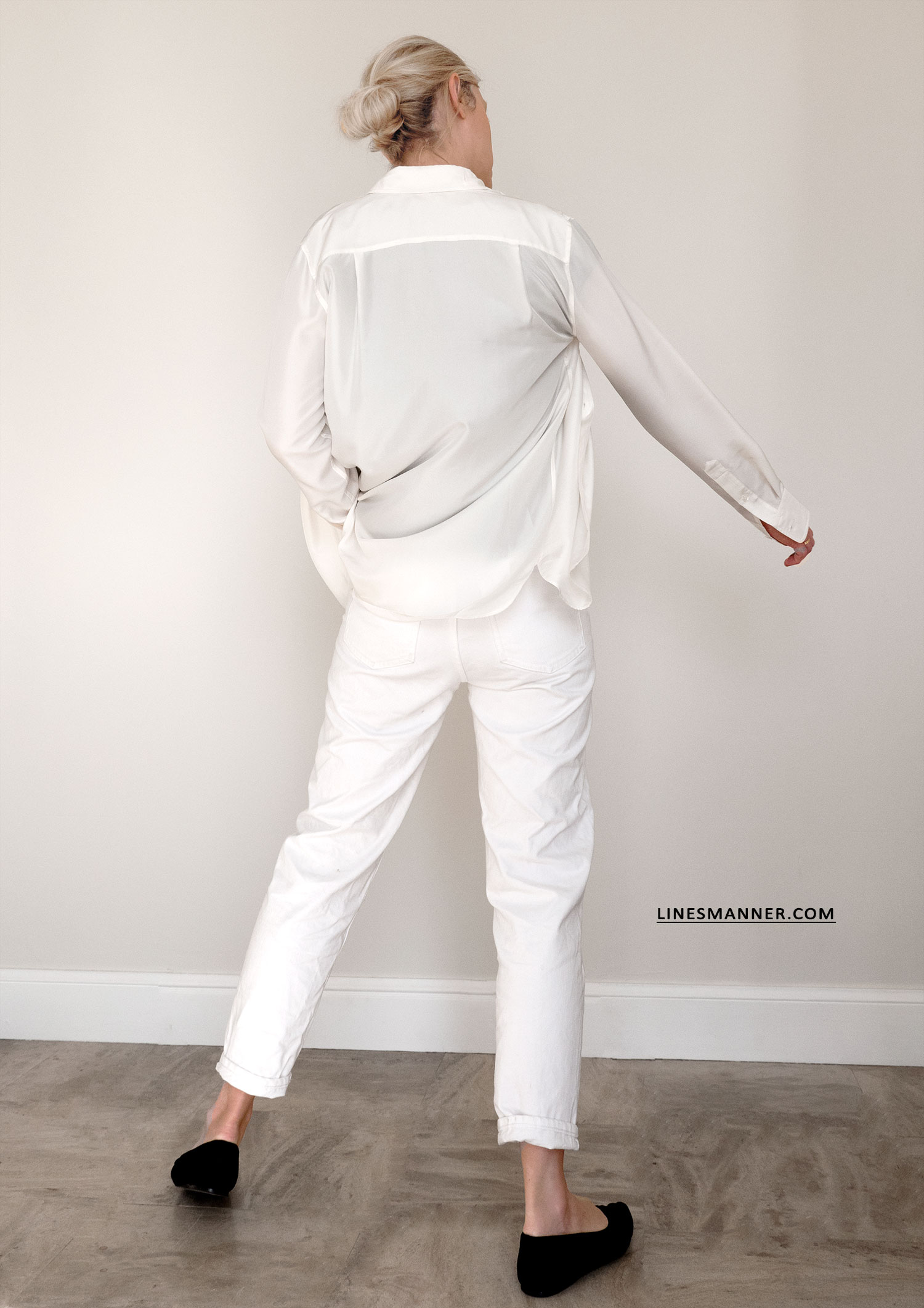 Tenue en noir et blanc, mélangeant un ingrédient soyeux et un jean blanc cassé.
