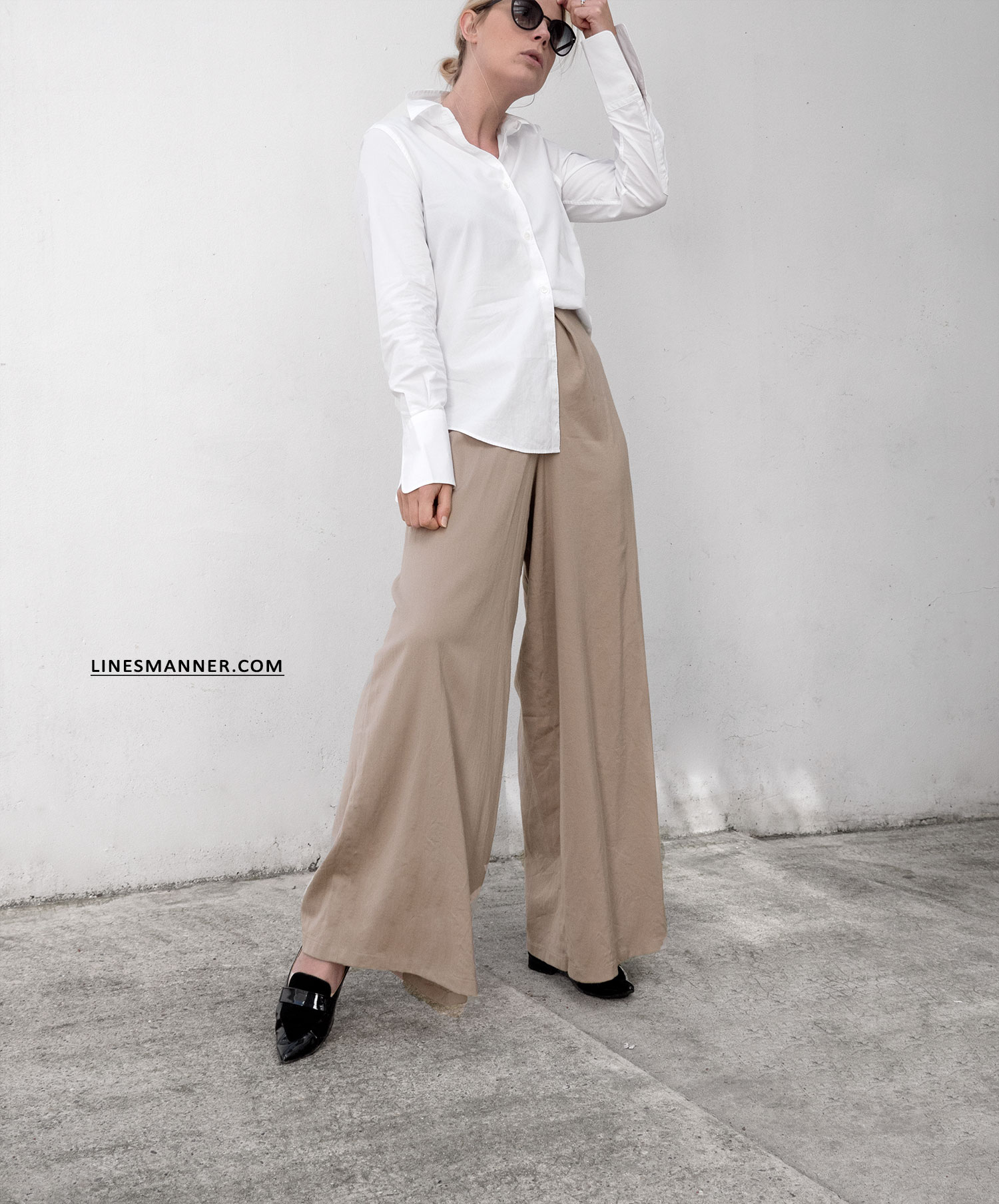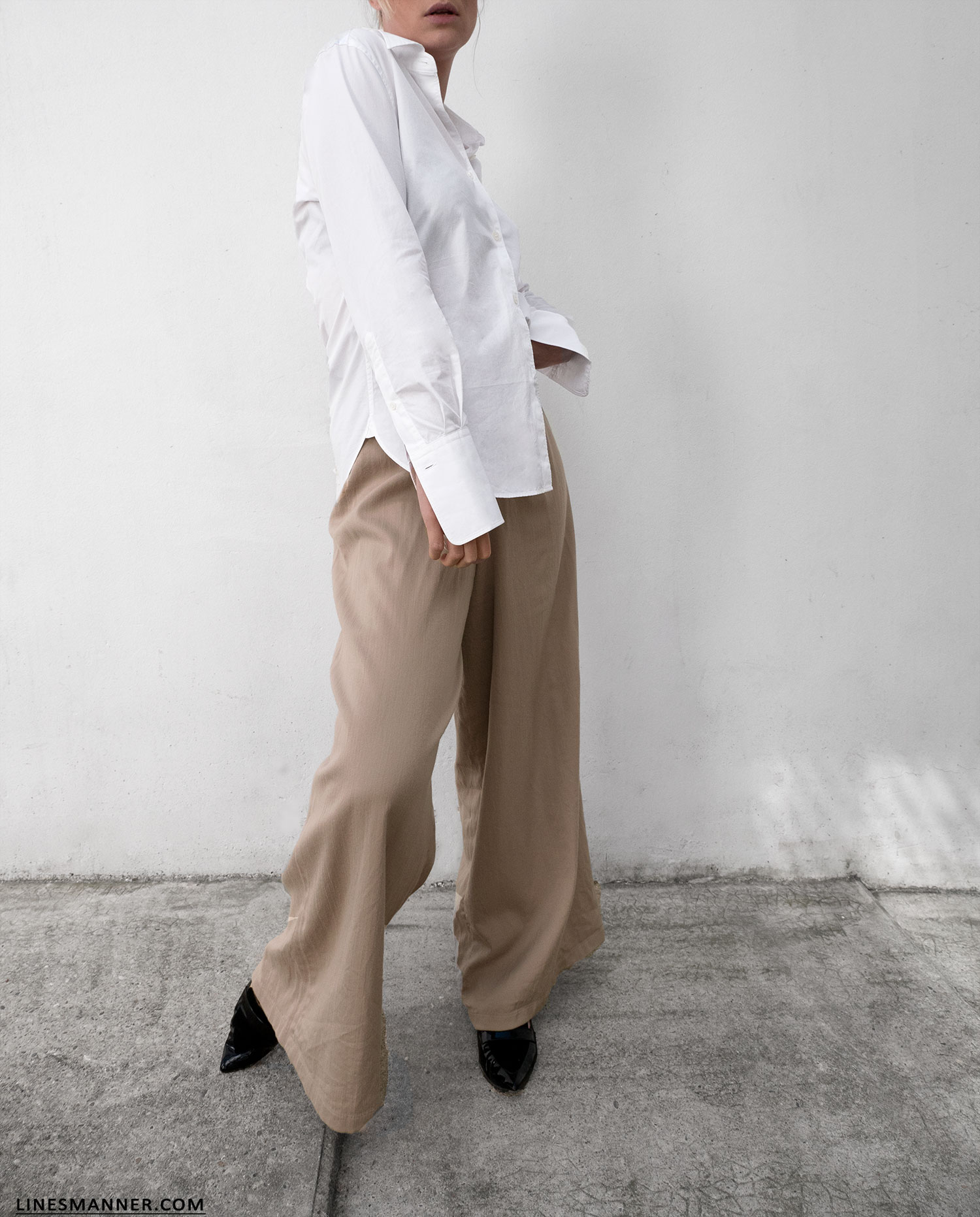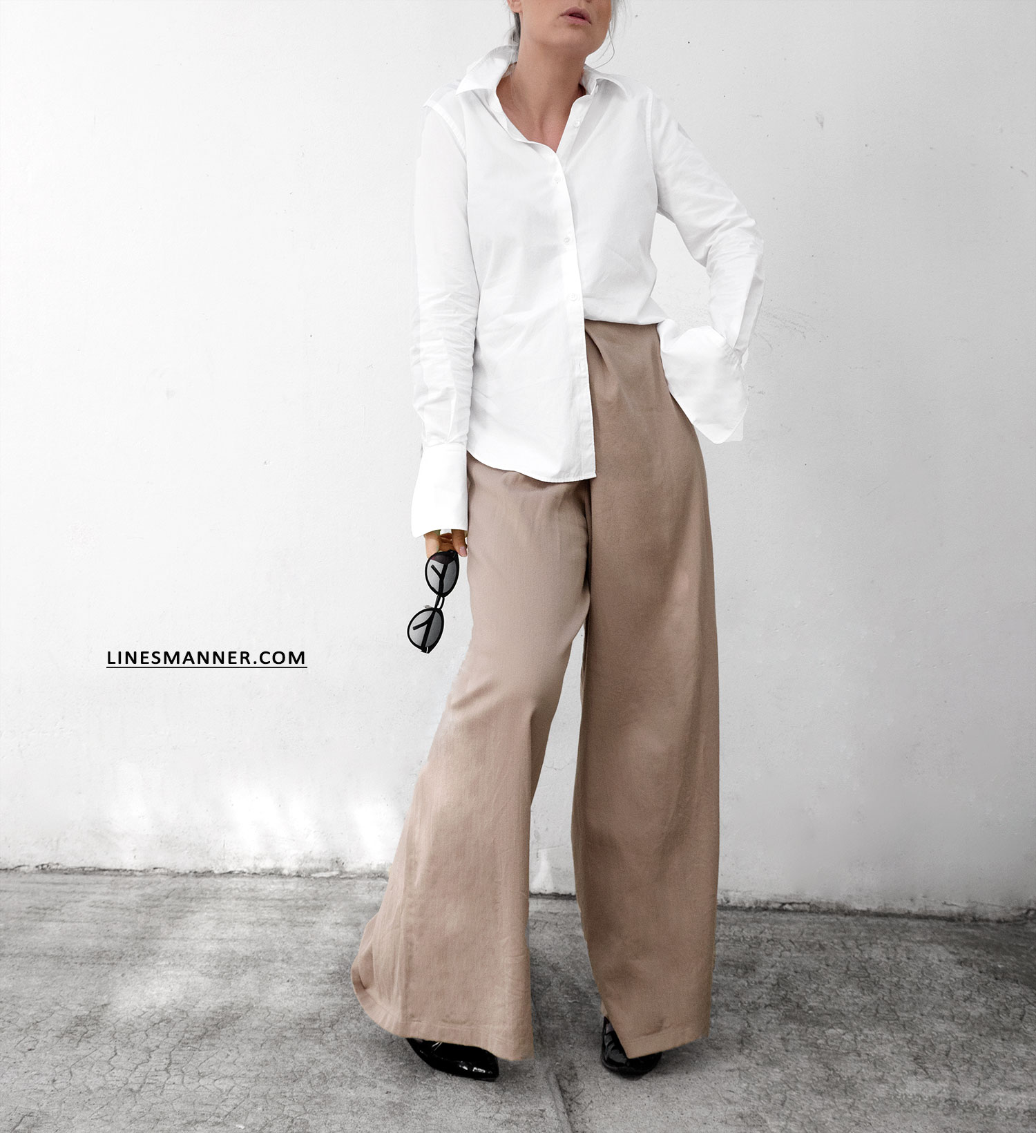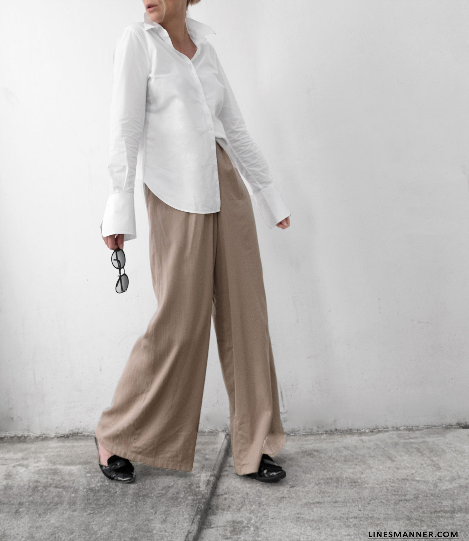 High-waisted wide-leg pants and oversized white shirt. A slouchy-structured game.