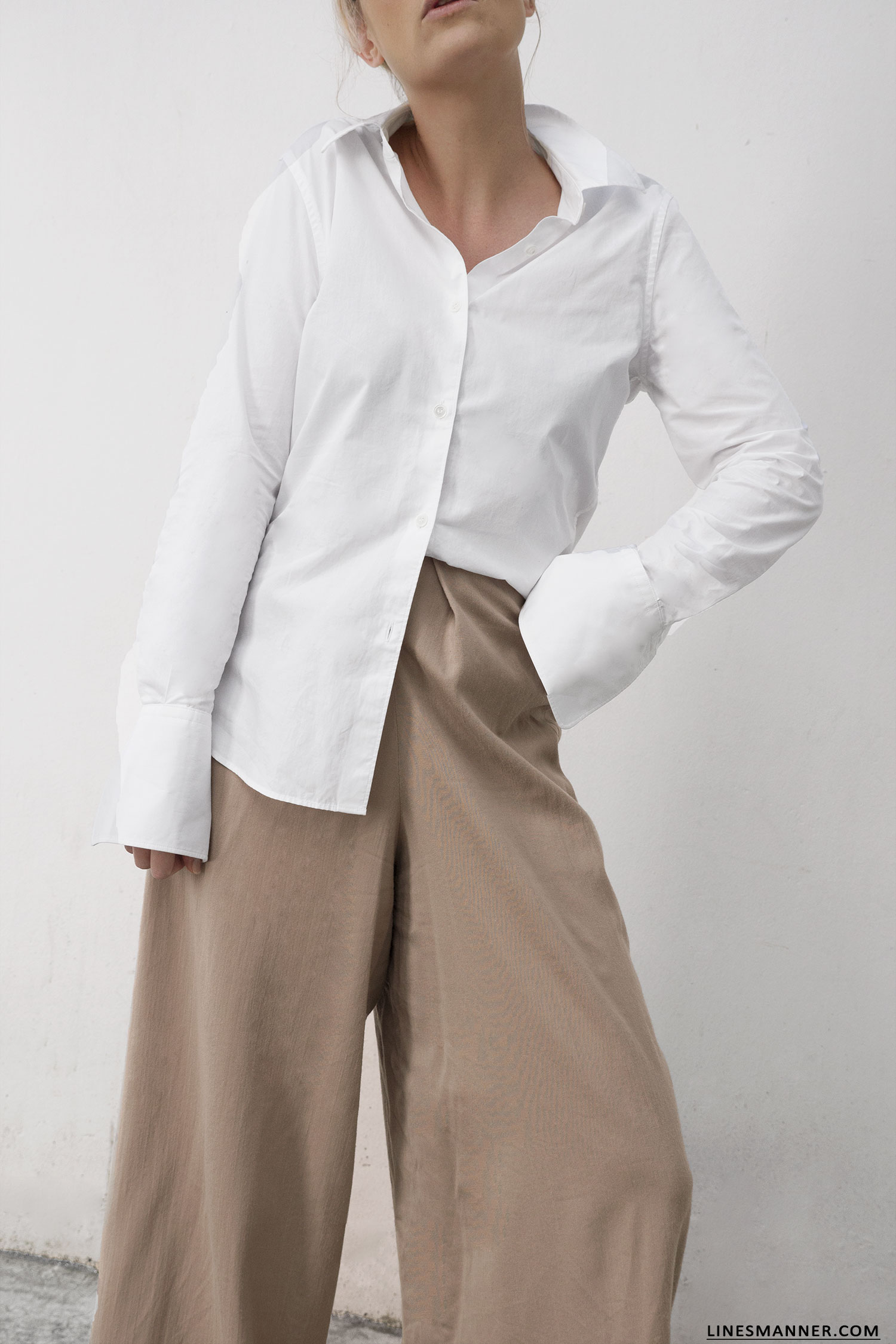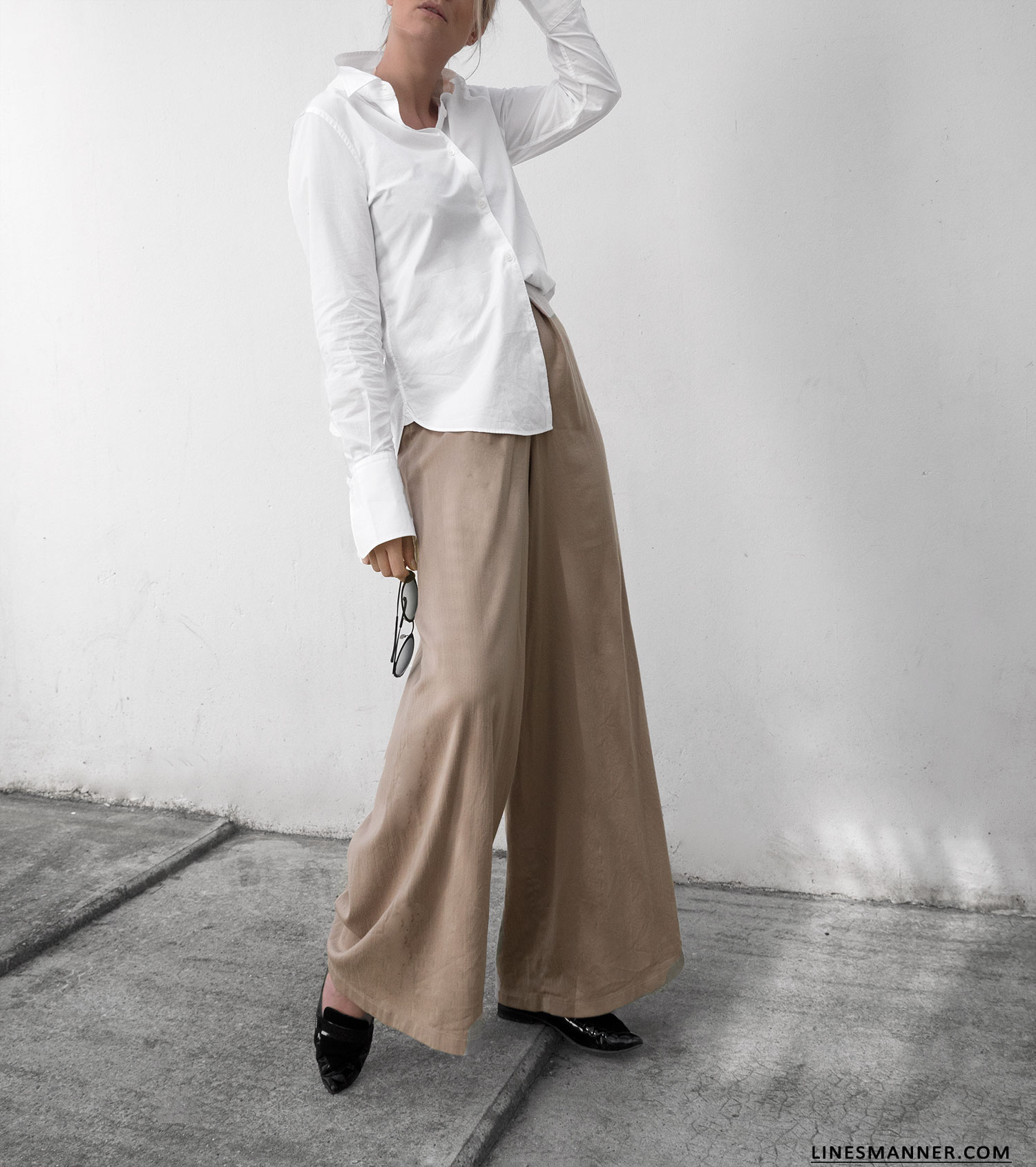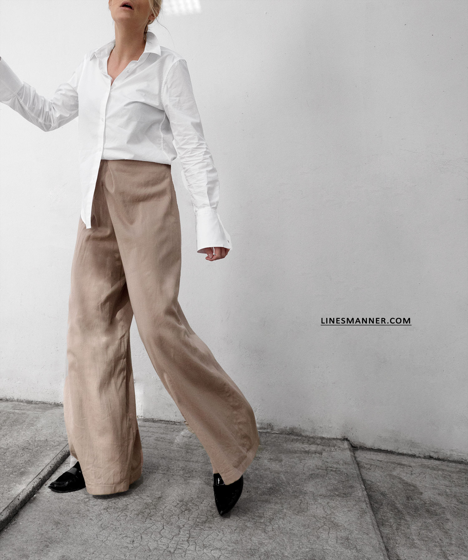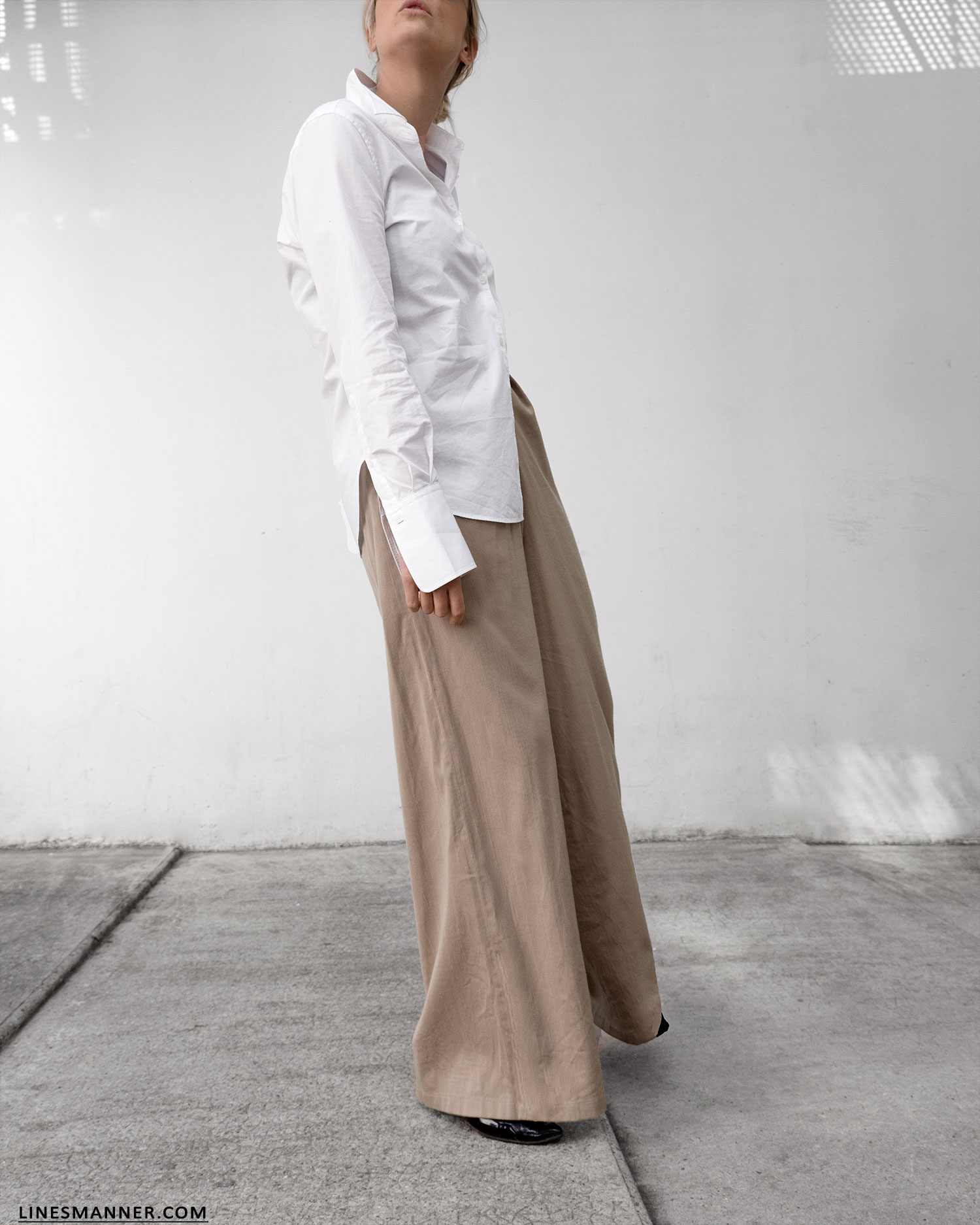 High-waisted wide-leg pants and oversized white shirt. A slouchy-structured game.