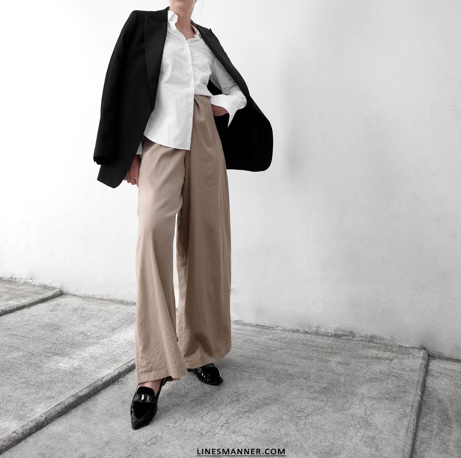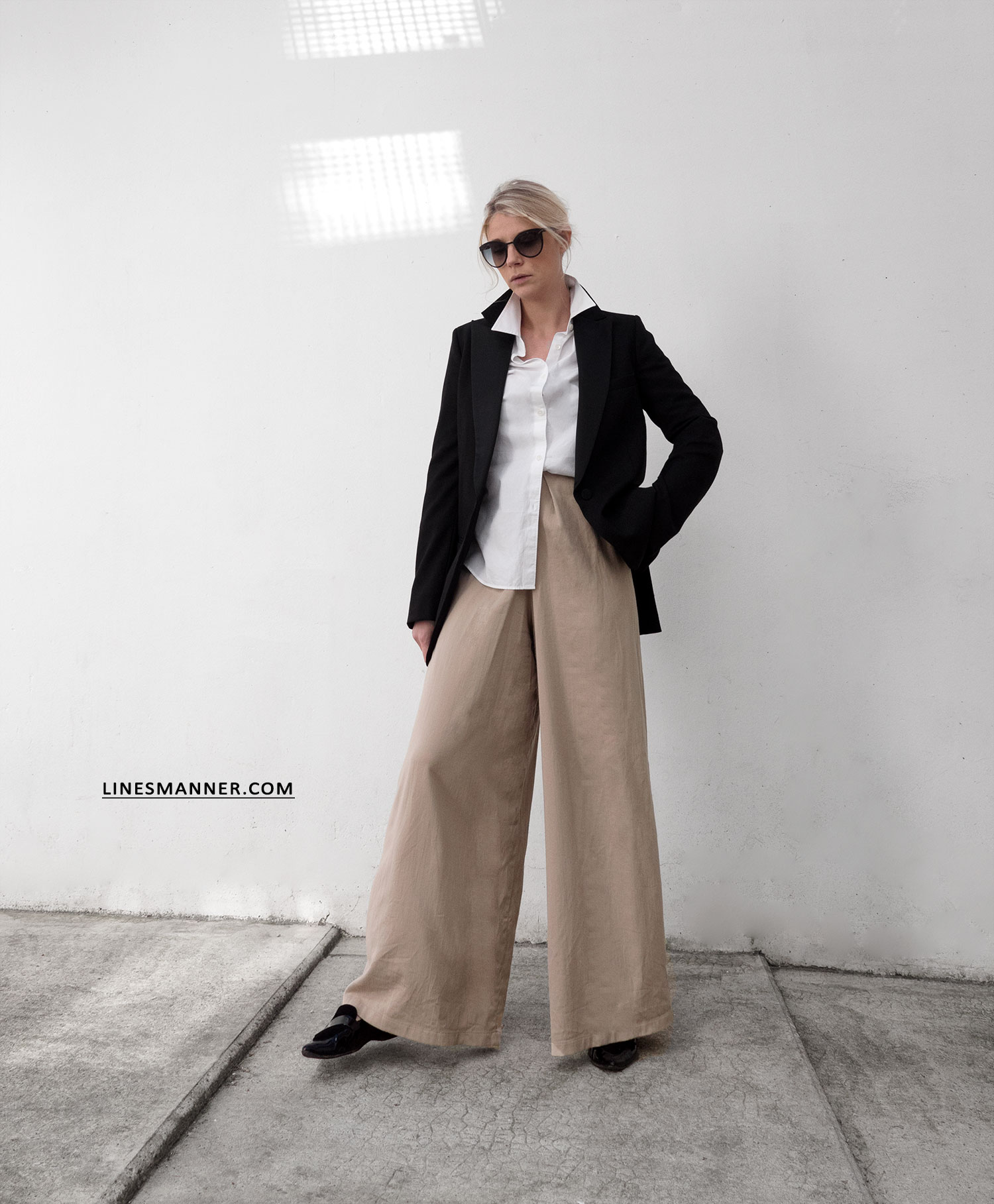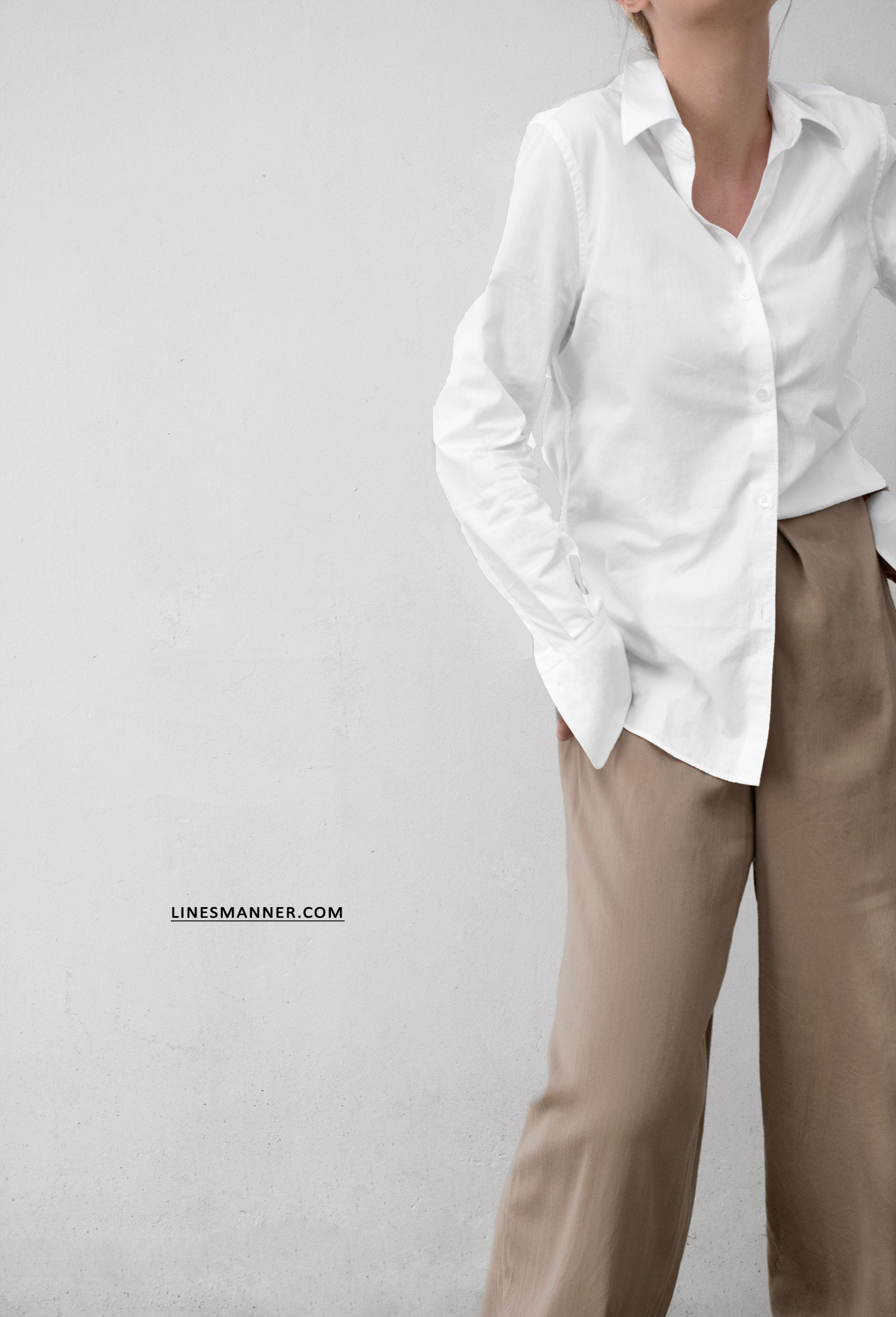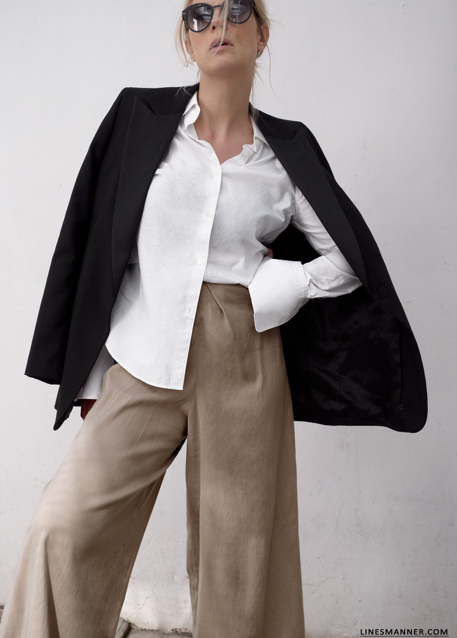 High-waisted wide-leg pants and oversized white shirt. A slouchy-structured game.